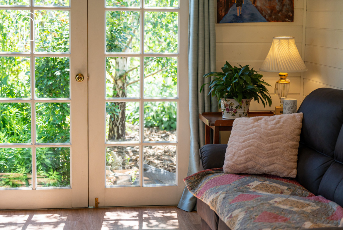 The sunken living room features a wall of corrugated iron behind the Esse wood heater and French doors to access the cottage garden. A place to relax and enjoy the serenity and views.