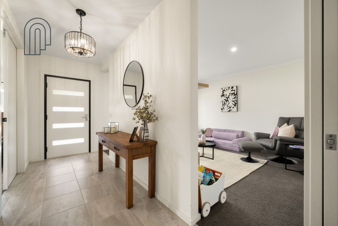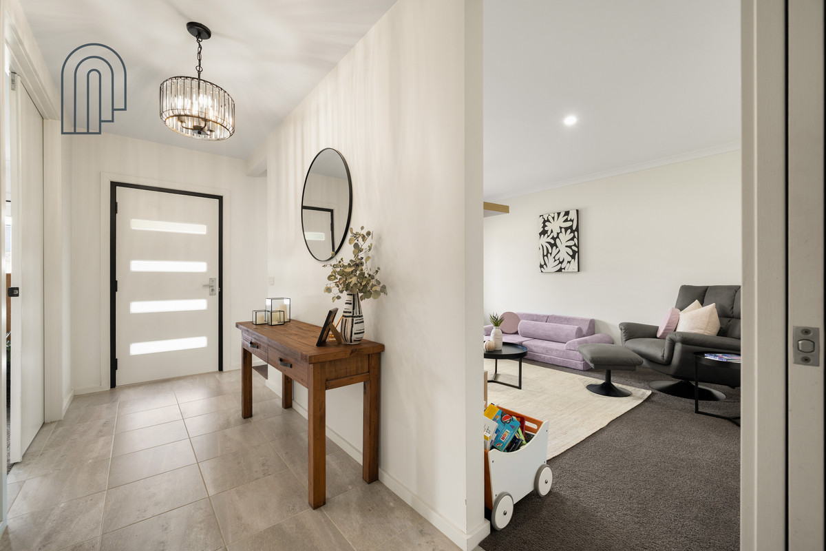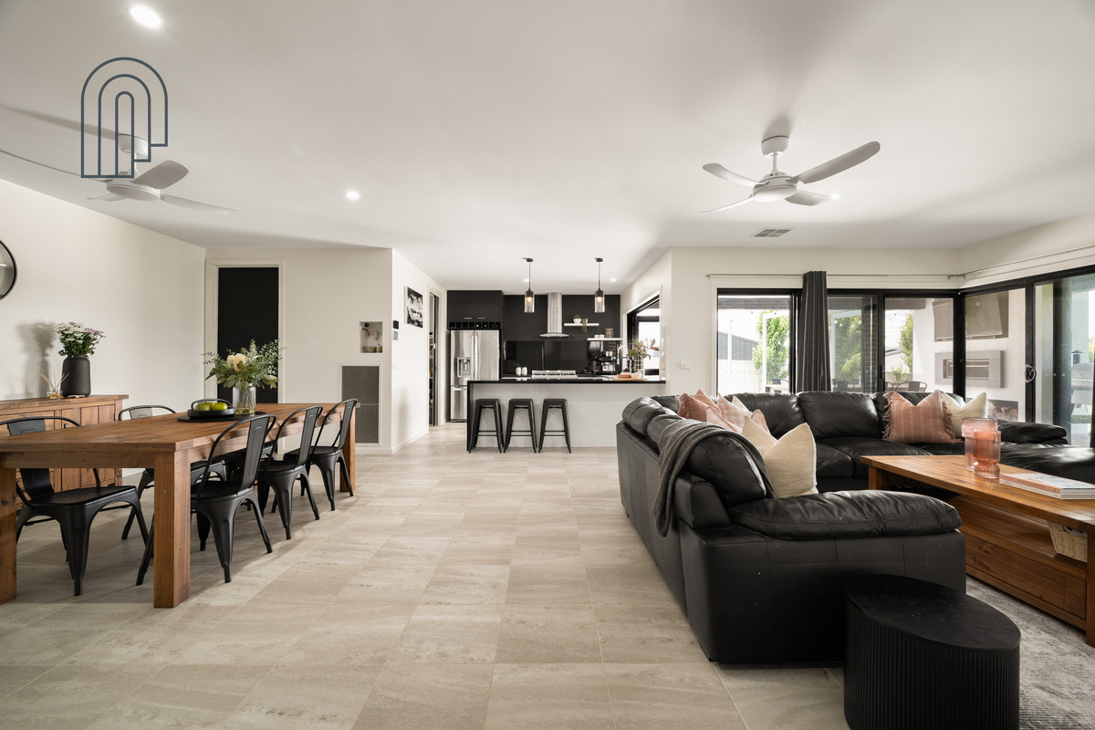 Multiple living areas ensure excellent versatility, with a separate formal lounge flowing through to the expansive open-plan kitchen, living, and dining area. The contemporary kitchen features a walk-in pantry, dishwasher, 900mm cooktop and oven, and a convenient servery to the outdoor entertaining zone.