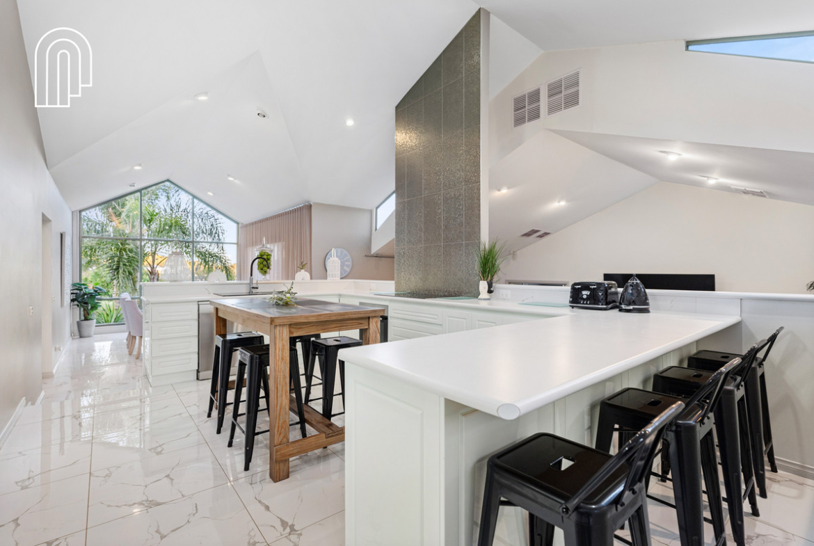 At the heart of the home lies the gourmet kitchen, where high-end appliances, stone benchtops, and ample storage combine to create a space that’s as functional as it is beautiful. Flowing seamlessly into the open plan living and dining areas, this central hub is ideal for both family living and entertaining.