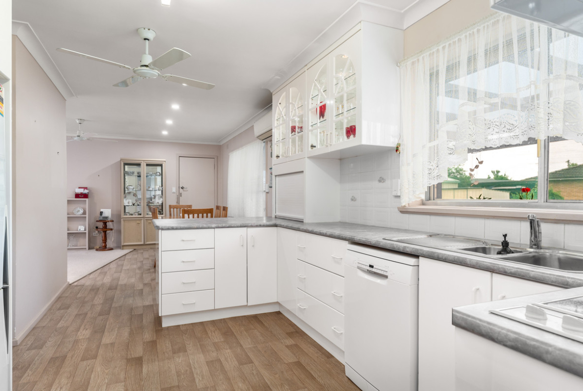 The home features a practical galley-style kitchen with ample storage and windows overlooking the backyard, creating a pleasant and functional cooking space. Adjoining the kitchen, the dining and living areas flow together seamlessly, ideal for relaxed everyday living.